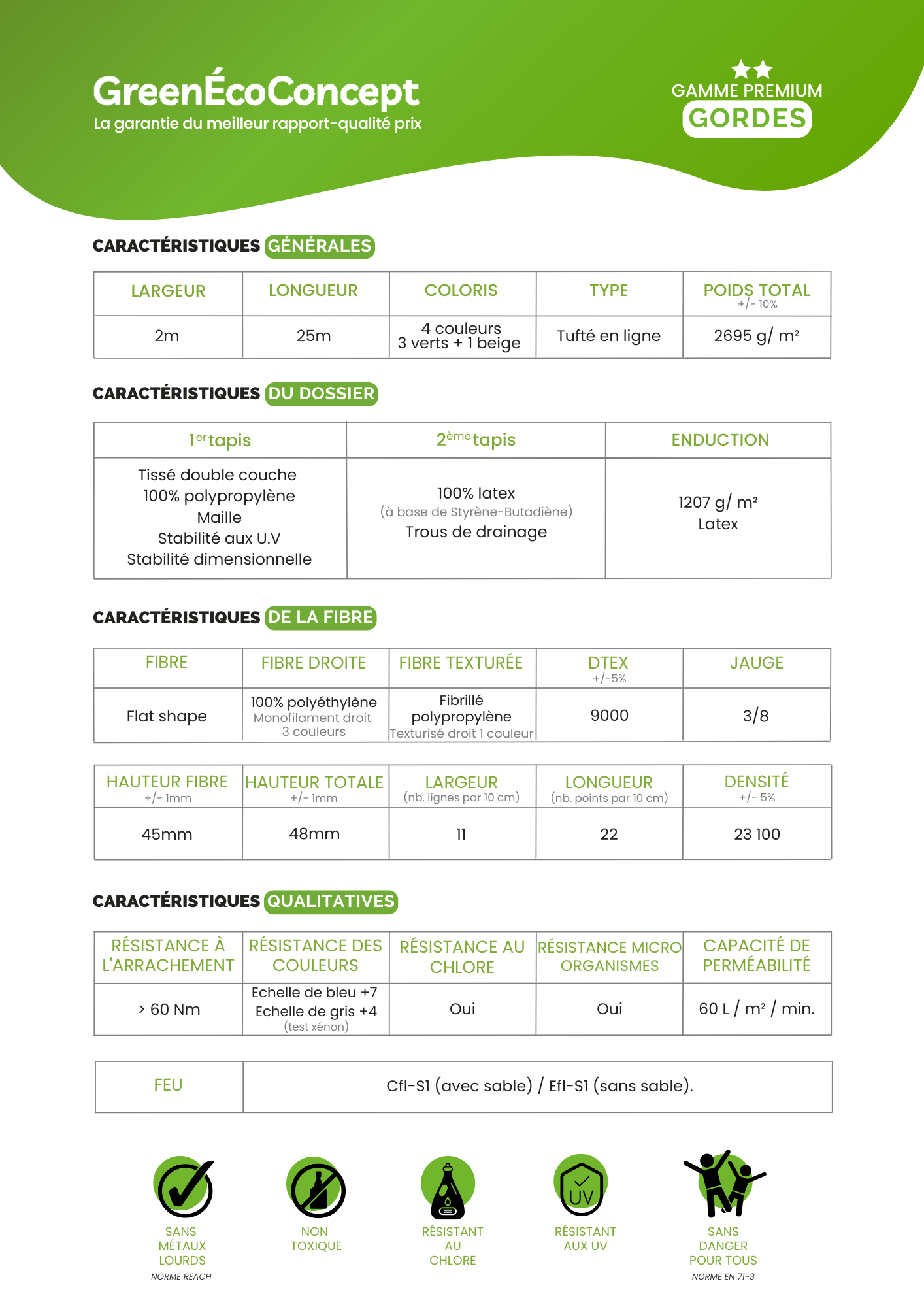 Le Gordes 45 mm est l’un de nos modèles les plus populaires pour l’aménagement de grands espaces verts. Sa hauteur de fibre généreuse lui confère un aspect « herbe haute » très naturel qui s’intègre parfaitement dans les paysages méditerranéens ou les jardins arborés. C’est le choix idéal pour ceux qui souhaitent oublier la tondeuse tout en conservant l’esthétique d’une pelouse dense et vigoureuse.